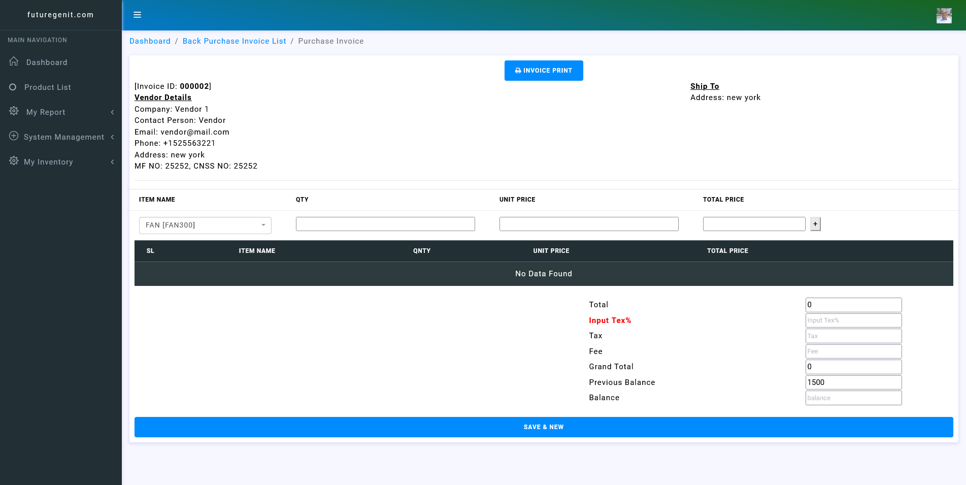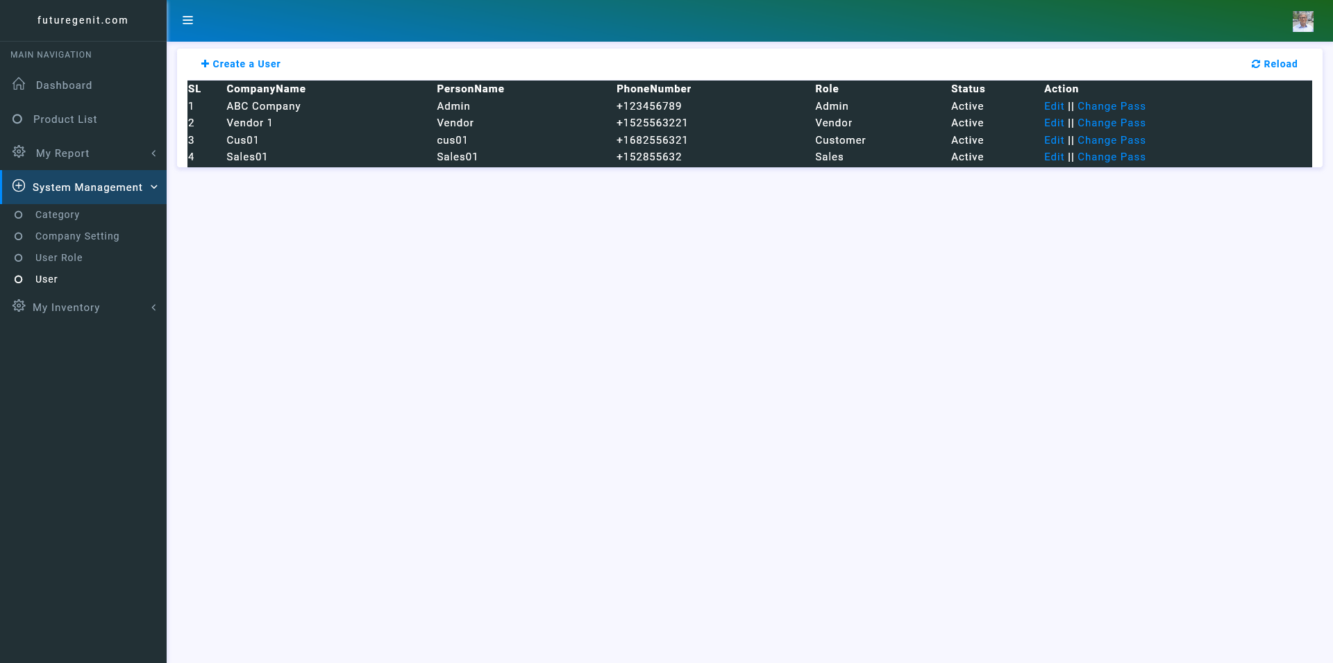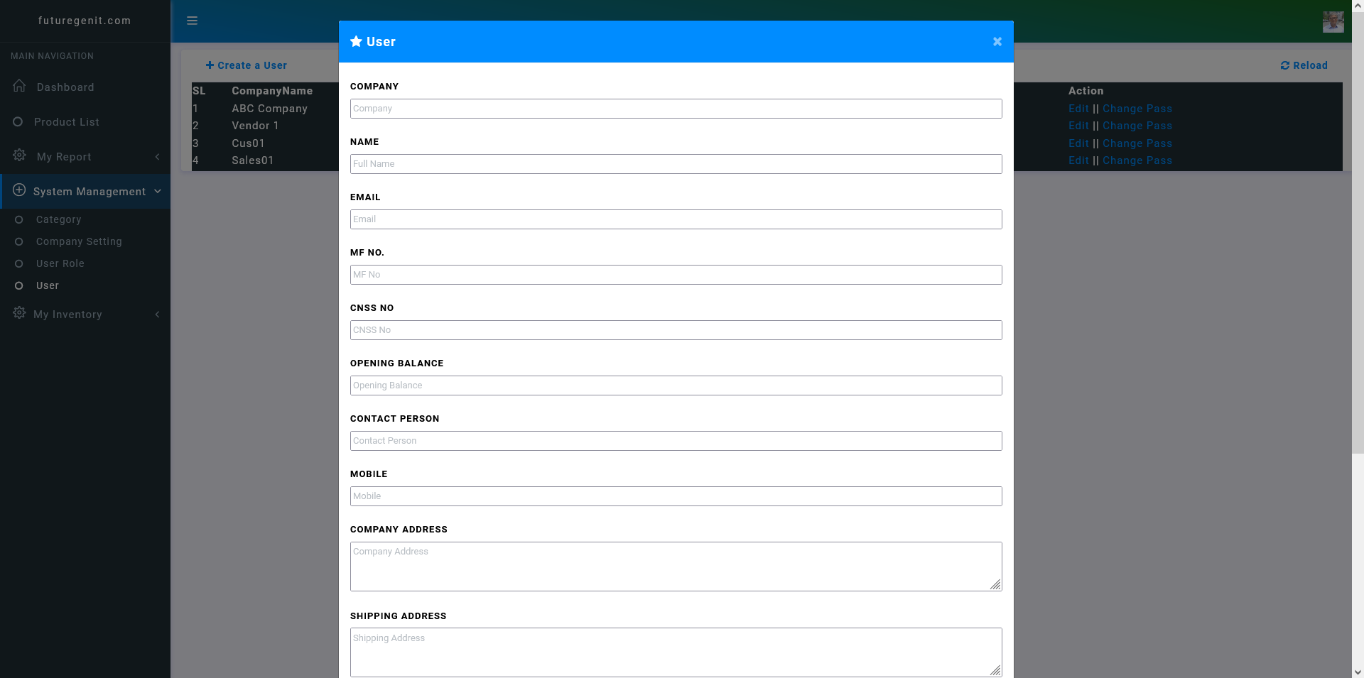 Interactive Dashboard, Company Setting, Create User Role, Create User, Create Company, Create Item, Create Vendor, Create Purchase Invoice, Create Customer, Create Sales Invoice, Create Devid Account Type, Create Credit Account Type, Create Bank Account, Create Expense, User List, User Role List, Company List, Item List, Vendor List, Purchase Invoice List, Customer List, Sales Invoice List, Item List, Devid Account List, Credit Account List, Bank List, Expense List, Profit & Loss Reports, more.....
