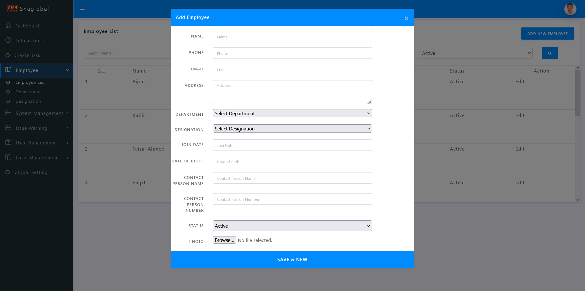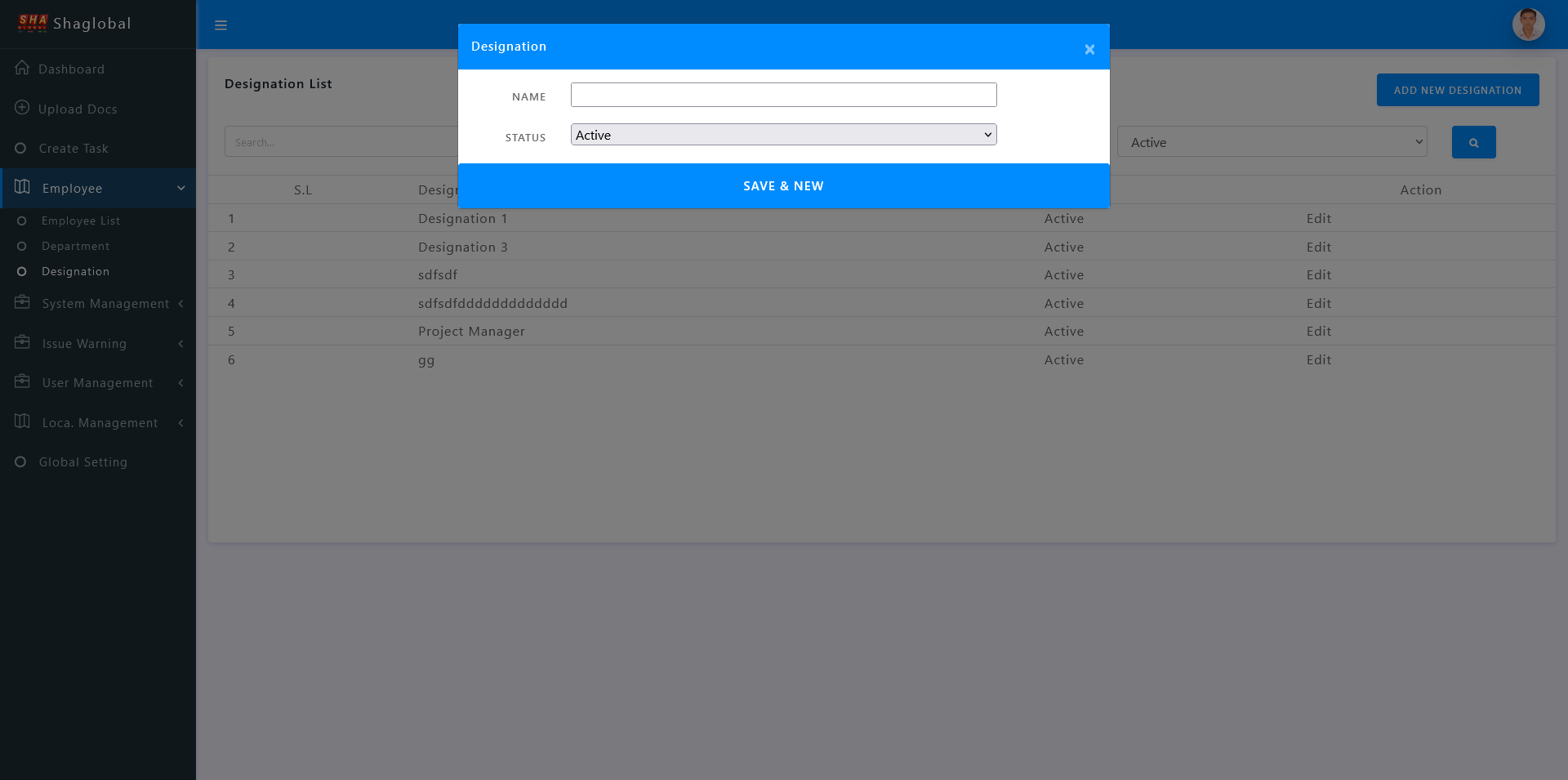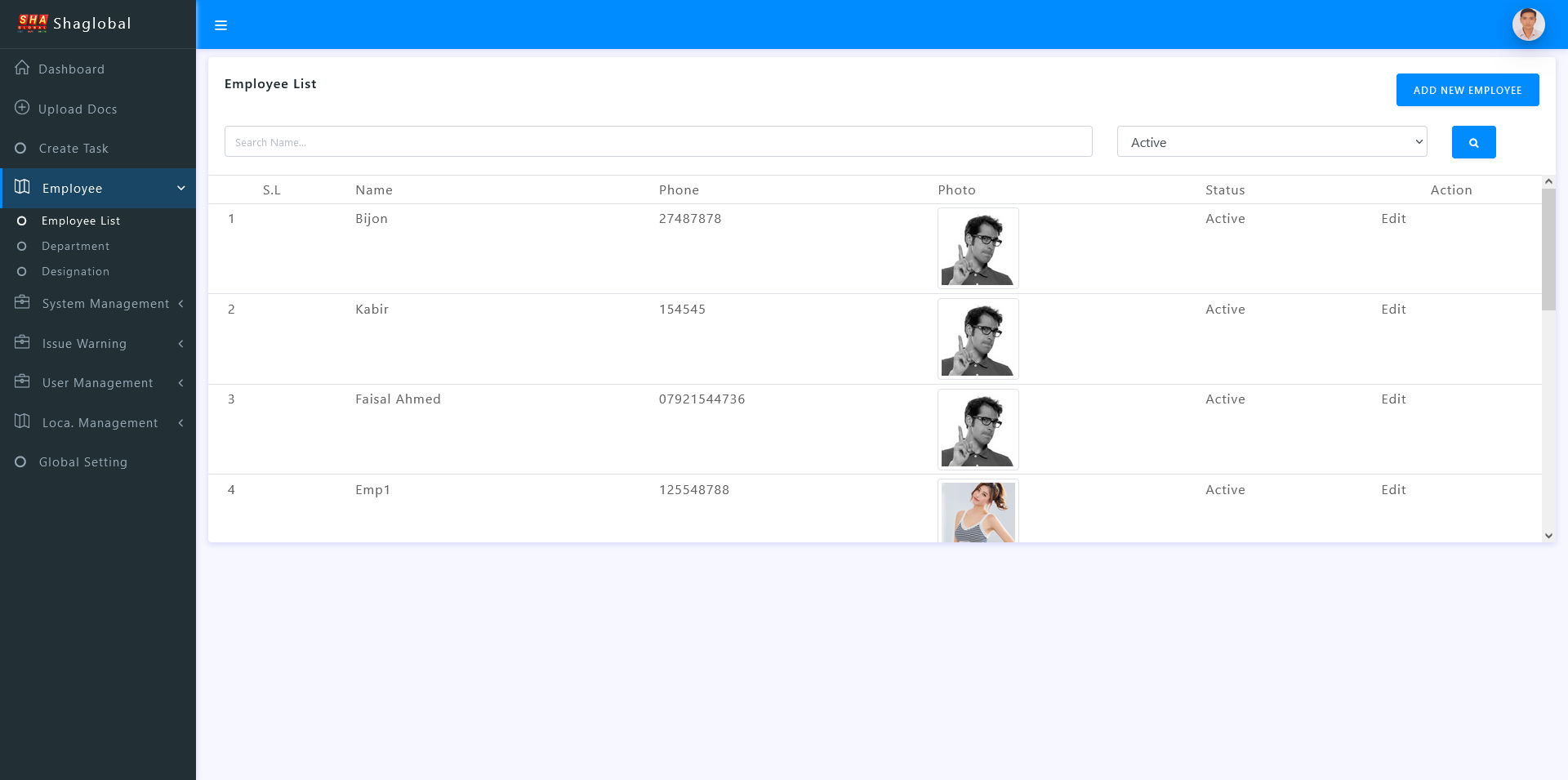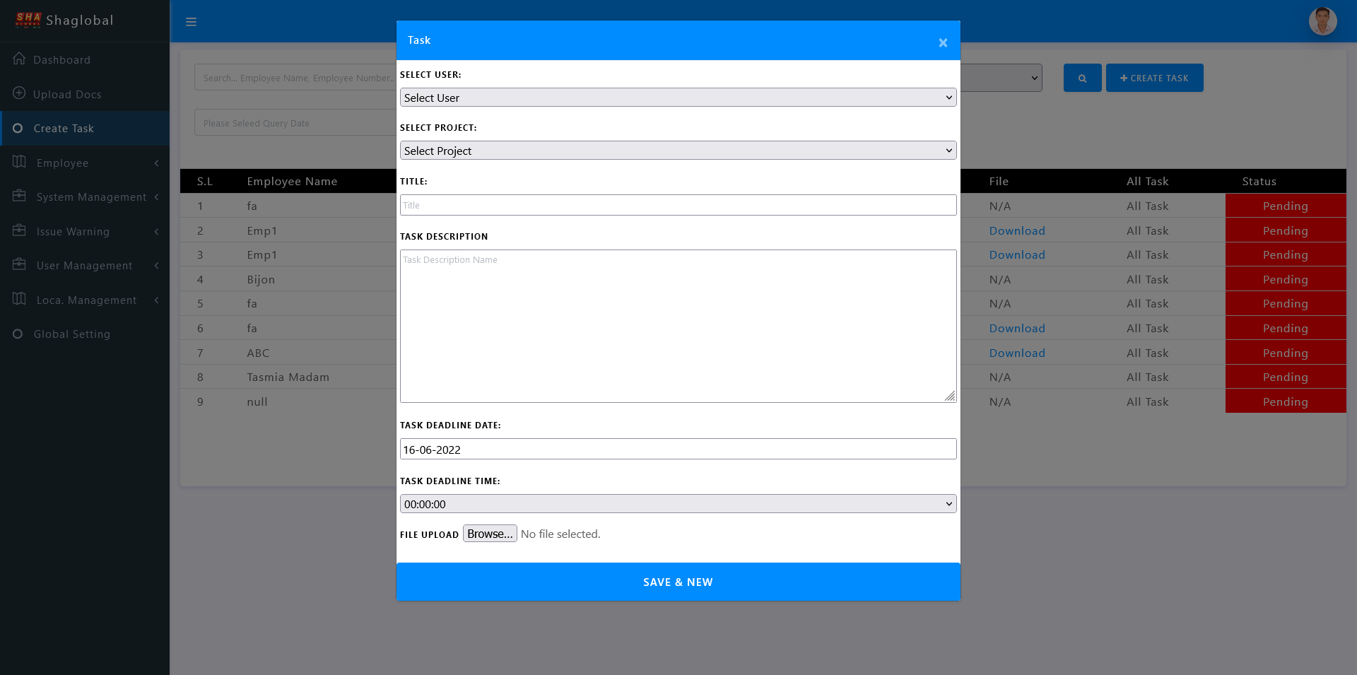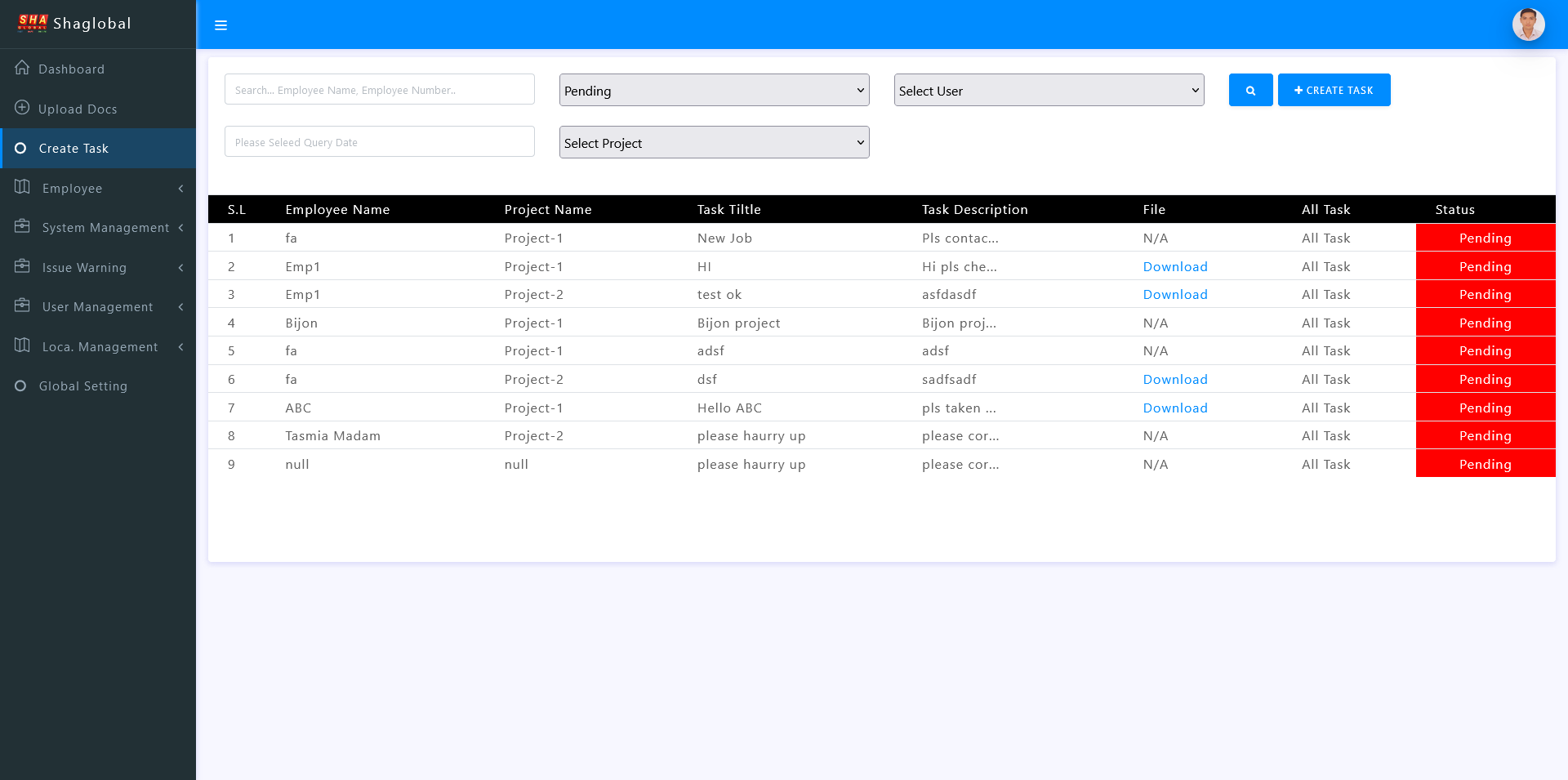 Interactive Dashboard , Employee List, Create Employee, Department List ,Designation List ,Project List, Create Project ,Create Task ,Task List ,Pending List ,Done Work, Create Project Log report, Upload Docs, Warning Letter, Issue Warning , User Role, User Lis, Global Setting