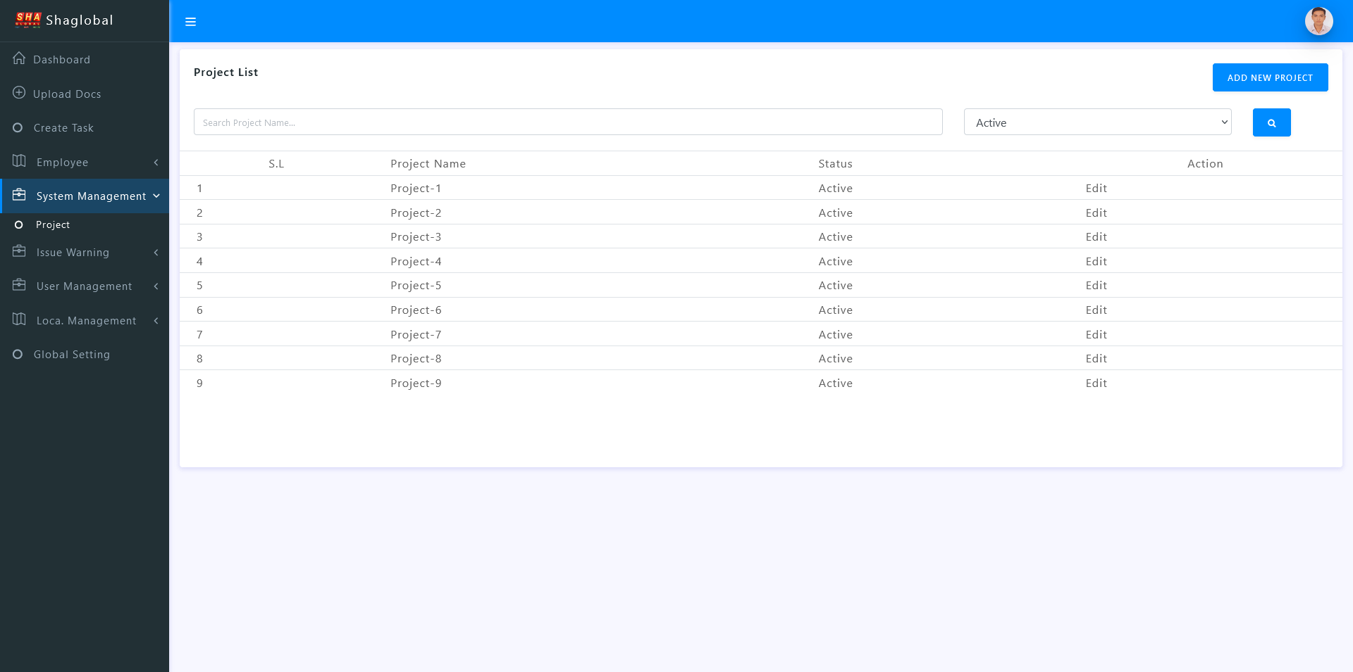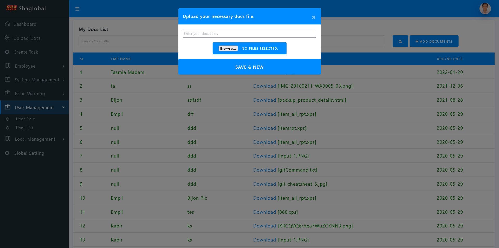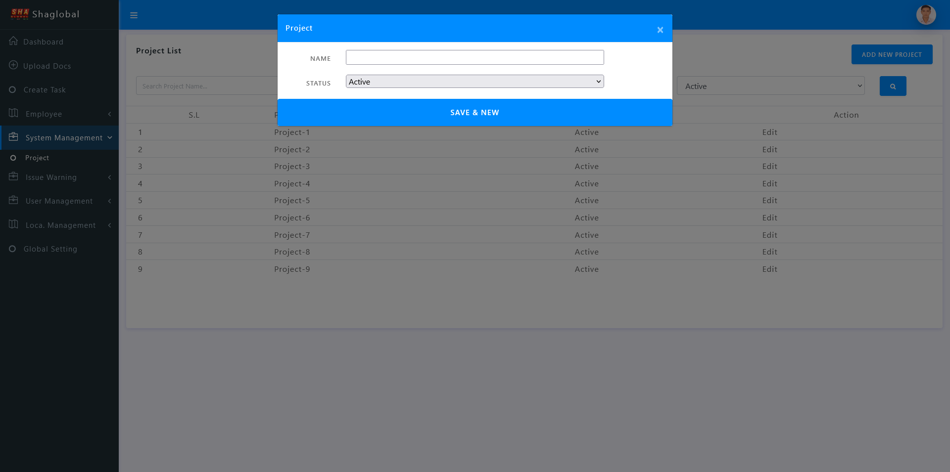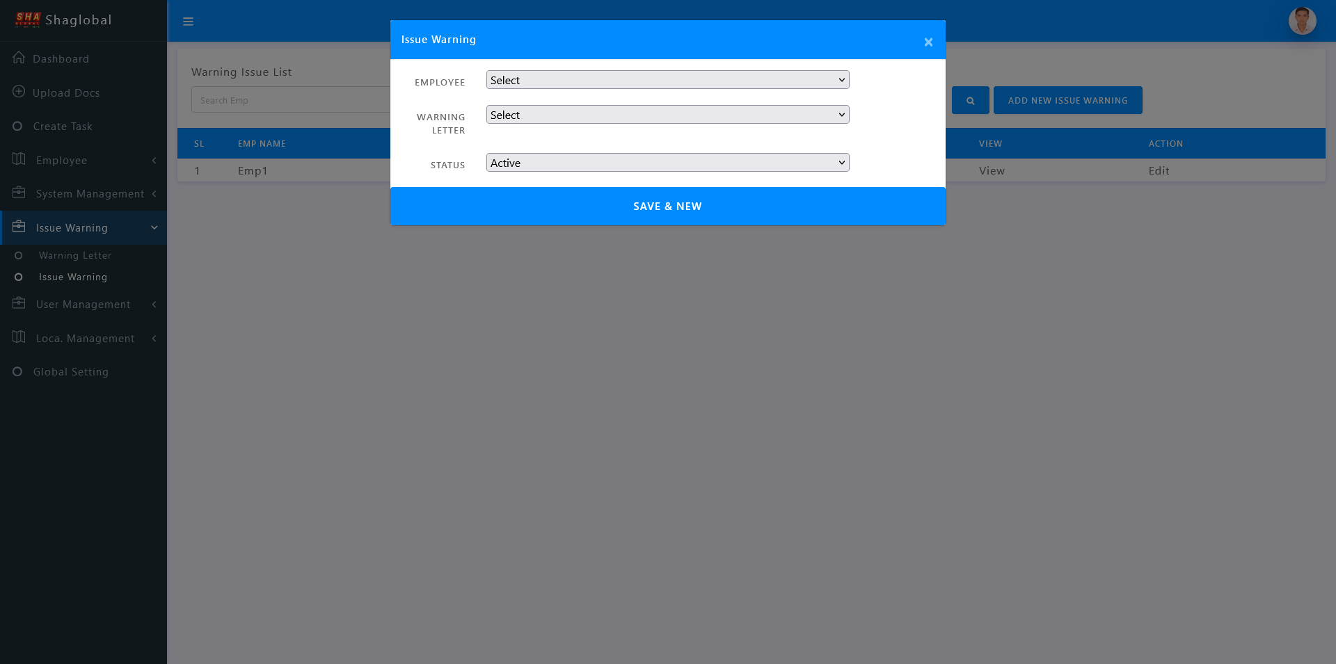 Interactive Dashboard , Employee List, Create Employee, Department List ,Designation List ,Project List, Create Project ,Create Task ,Task List ,Pending List ,Done Work, Create Project Log report, Upload Docs, Warning Letter, Issue Warning , User Role, User Lis, Global Setting